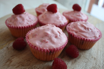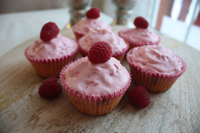 Her kommer oppskriften på vaniljecupcakes med bringebær og sjokolade. Har også et lag med bringebærkrem på toppen. Disse er såå gode!