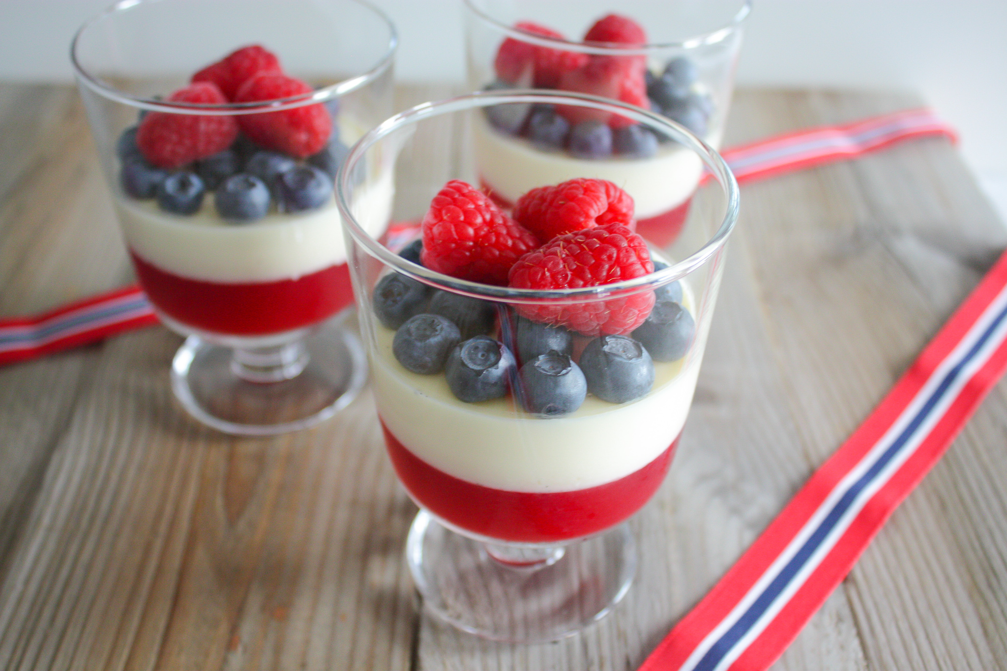 Pannacotta er en av mine favorittdesserter. I denne oppskriften har jeg valgt å lage en bringebærgelé, det er så godt med syrligheten i bringebærene sammen med vaniljepannacottaen. Pynter du de med blåbær har dessertene også alle fargene rød, – hvit og blå, som gjør at den passer perfekt til 17. mai! Denne desserten kan fint lages noen dager før du skal ha gjester.