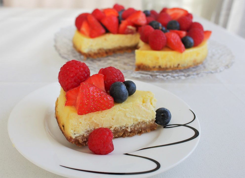 – Ta ostekaken ut av ovnen og la den avkjøle seg i formen. Deretter lar du kaken stå i kjøleskap i minst 4 timer. Pynt med bær rett før servering.