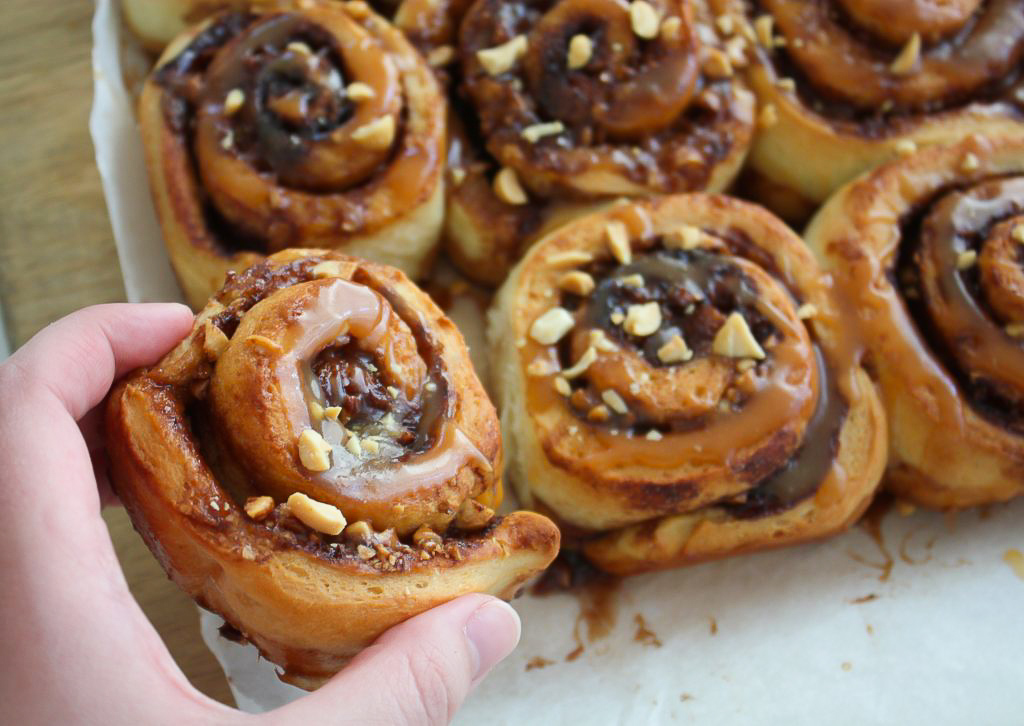 Hvis du er glad i snickers og gjærbakst vil du elske disse bollene! Deilige snurrer med sjokolade, salt karamell og peanøtter!