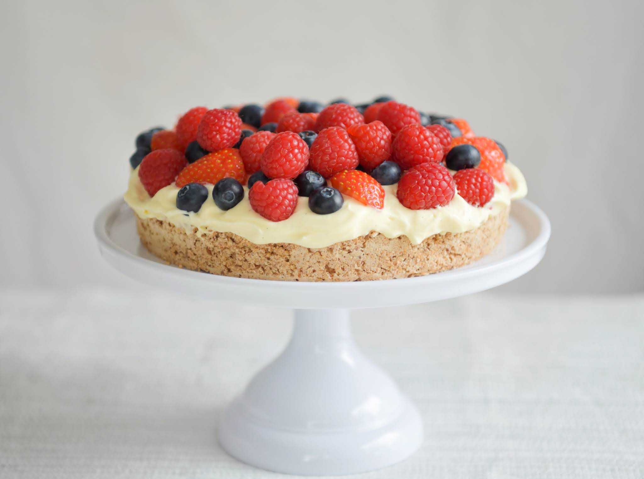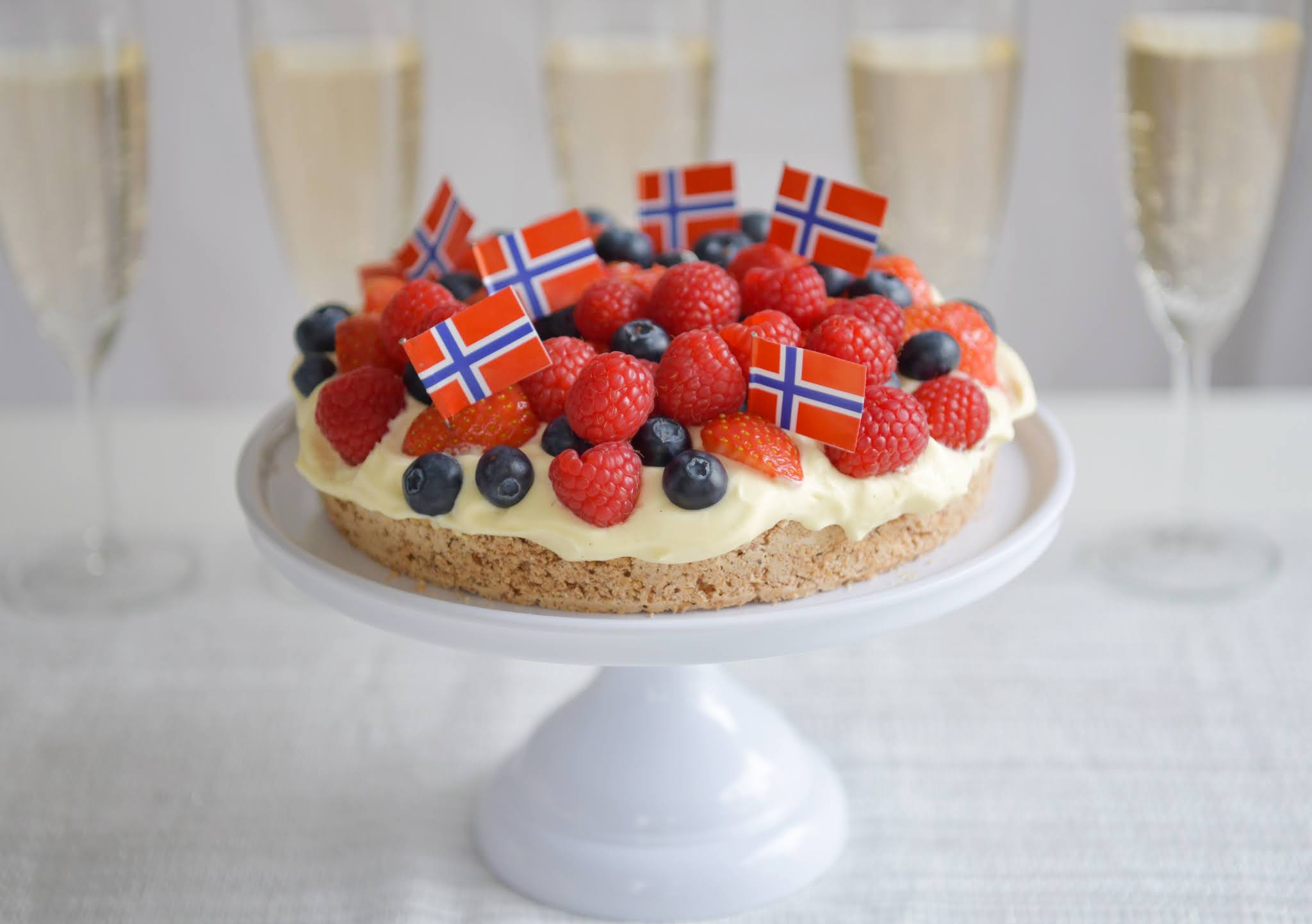 Her kommer oppskriften på en deilig og frisk kake med mandelbunn, vaniljekrem og masse bær. Denne kaken passer perfekt til 17. Mai og sommerfester. Den er også glutenfri!
