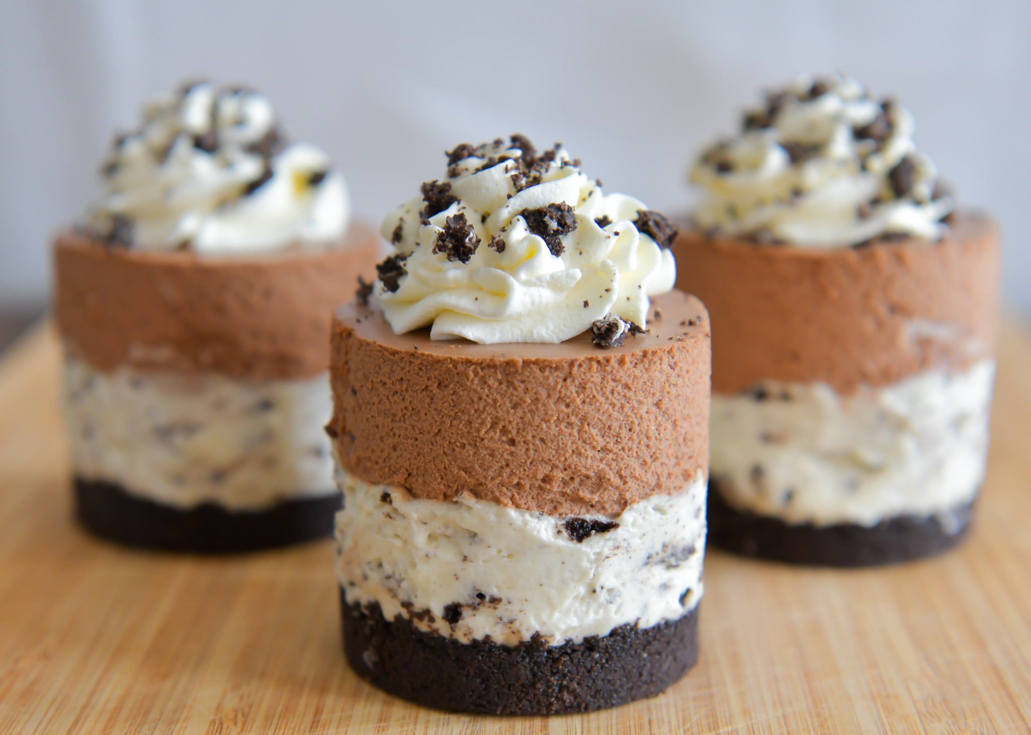 Oreokake er en veldig mektig kake, derfor passer den fint å servere i porsjonskaker. Disse kakene lages med et lag med ostekrem og sjokolademousse og får en deilig, kremete konsistens. Er du glad i Oreo er dette kaken for deg!